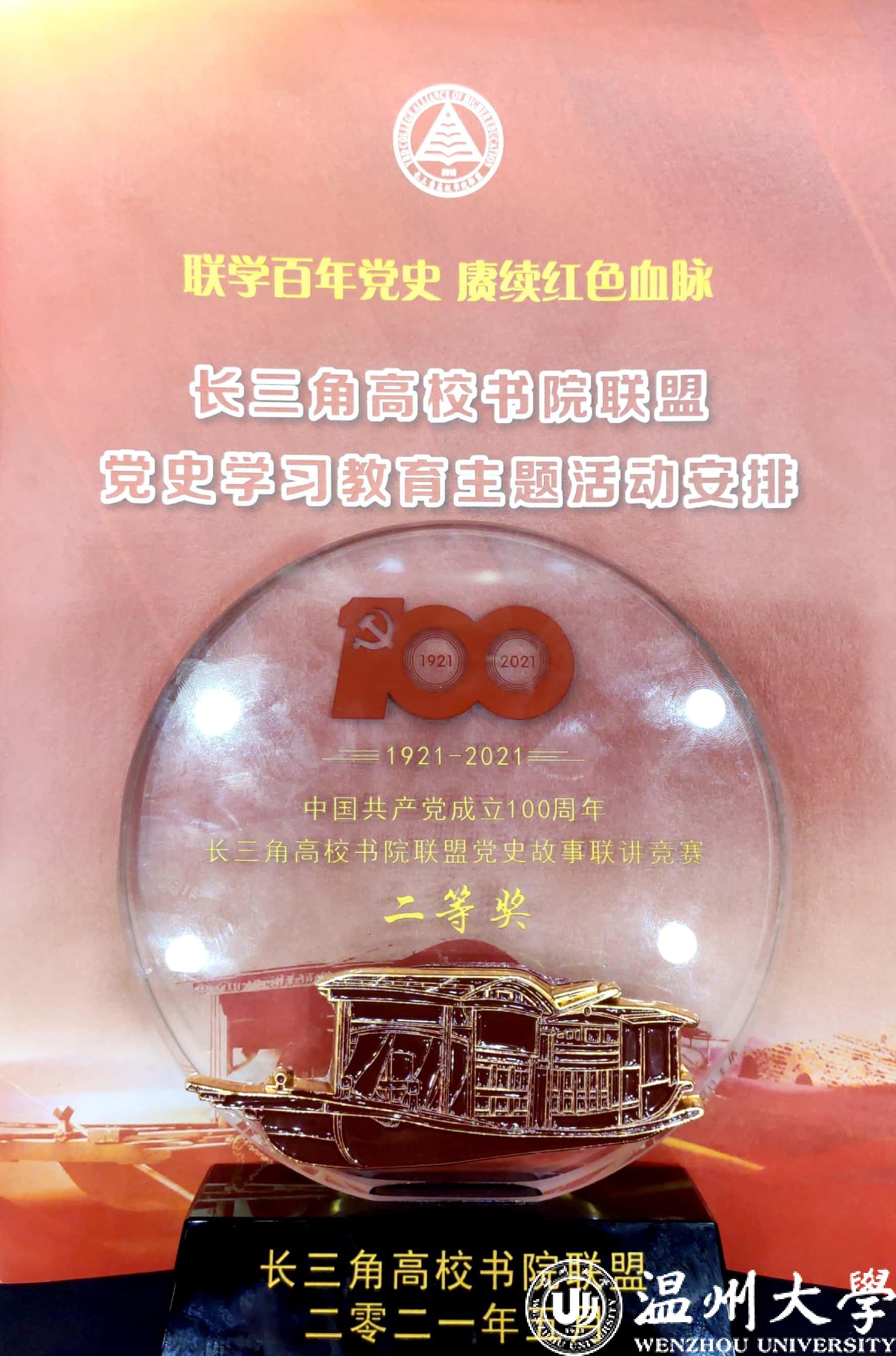 温州大学溯初书院参赛作品为《心中最美的那抹红——致敬温州大学校友、国旗设计者曾联松》,学生党员代表薛彬茹、王越、范献丽以国旗红代表的奋斗红、志愿红和爱国红为演讲主线,深情并茂地诉说温州大学校友曾联松先生与国旗的故事、“知心姐姐”无私奉献的志愿精神和温州大学浓厚的国旗文化,获得二等奖的优异成绩。在竞赛现场,复旦大学志德书院、华东师范大学孟宪承书院、江苏师范大学敬文书院等分别展演了《家国天下邵力子》《从抗战精神中汲取前行的力量——对金山卫抗日战争的感悟》《王杰精神:用生命书写火热的青春篇章》等作品。一个个党史故事,震撼人心,可歌可泣,在场师生无不为党史故事中英雄们舍生忘死、为国为民的精神所感动。当晚,现场还举行了长三角高校书院联盟党史联学活动,设计了宣讲、朗诵、情景剧、合唱等环节,开展了“淮海战役精神”宣讲、《狱中自述》朗诵、音诗画讲述“淮海战役故事”:《一根小竹竿》《一双布鞋》《一声守望一世情》《信念》《共筑中国梦》等沉浸式节目,学习淮海战役精神,精彩地重温了革命故事和先烈担当,深情演绎出共产党人的家国情怀。