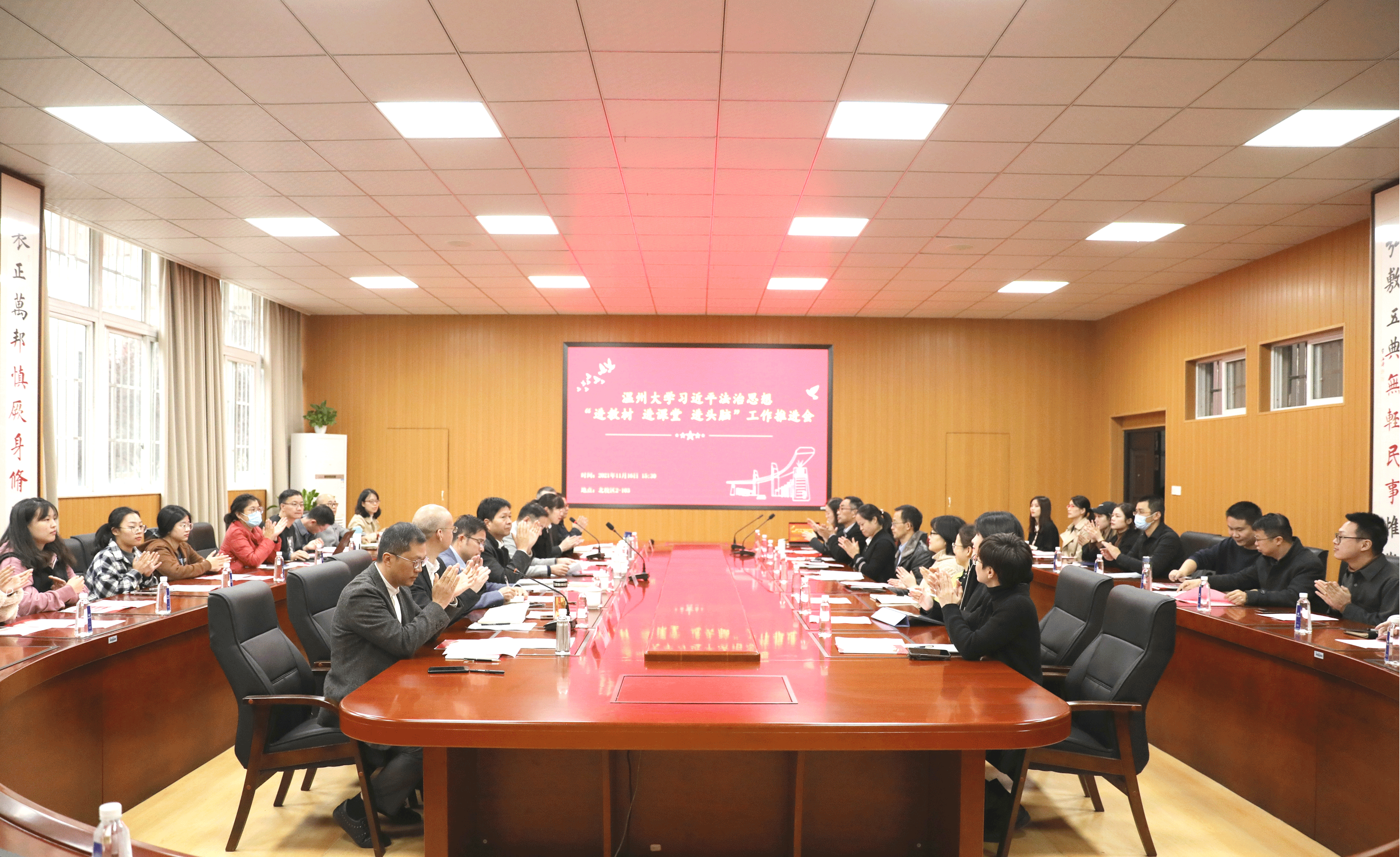 法学院副院长周湖勇宣读了《温州大学法学院习近平法治思想“进教材、进课堂、进头脑”方案》,该方案从教材建设、课程建设、课程组建设、教学改革与研究、学生社团建设等方面提出具体落实举措,这一系列举措旨在不断深化对习近平法治思想的理解和把握,持续推进宣传和贯彻习近平法治思想,促进习近平法治思想全面落实,推动习近平法治思想入脑入心,切实推进习近平法治思想融入法学教育以及其他专业人才培养全过程。