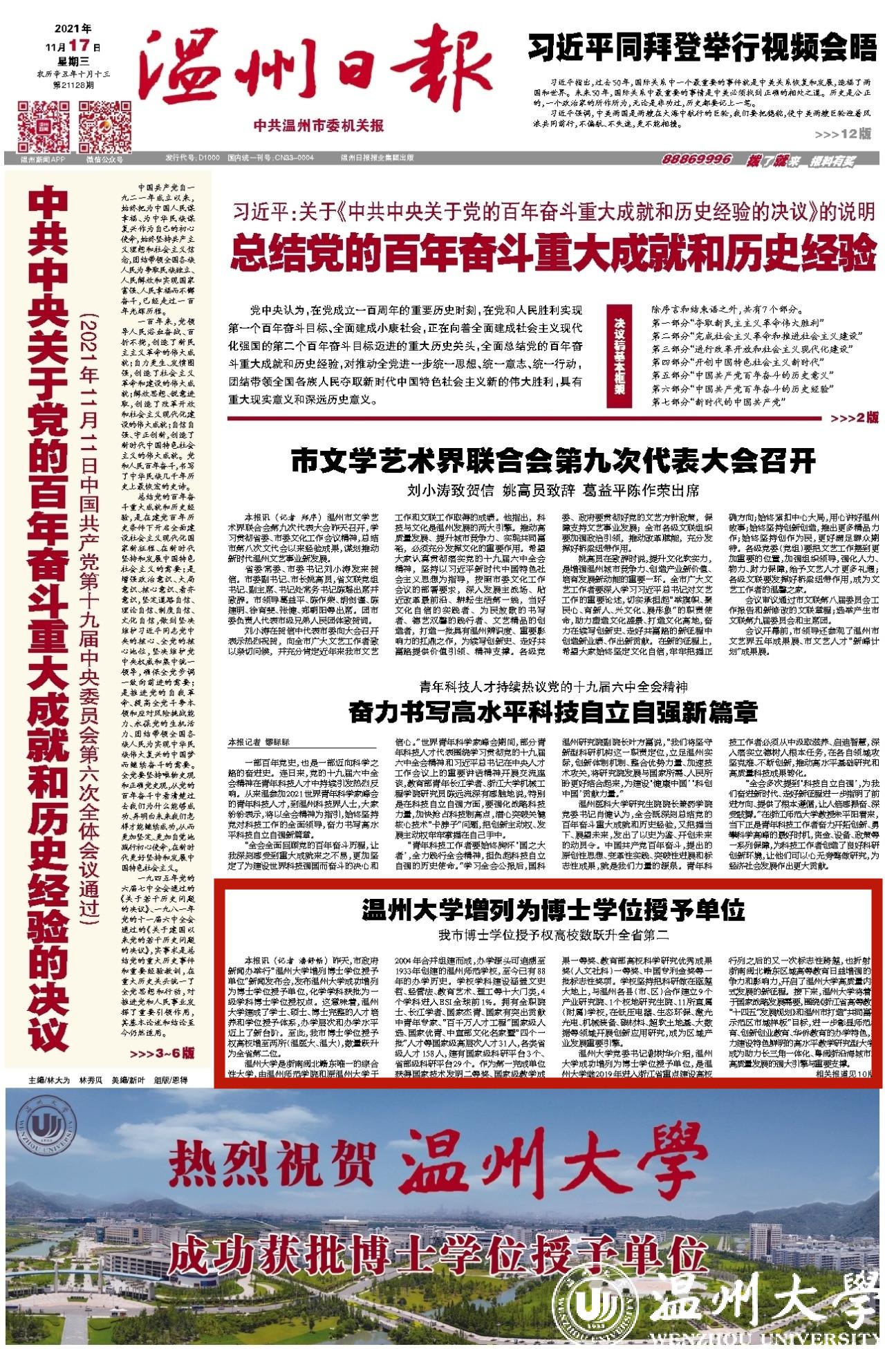 温州大学党委书记谢树华介绍,温州大学成功增列为博士学位授予单位,是温州大学继2019年进入浙江省重点建设高校行列之后的又一次标志性跨越,也折射出浙南闽北赣东区域高等教育日益增强的竞争力和影响力,开启了温州大学高质量内涵式发展的新征程。接下来,温州大学将着眼于国家战略发展需要,围绕《浙江省高等教育“十四五”发展规划》和温州市打造“共同富裕示范区市域样板”目标,进一步彰显师范教育、创新创业教育、华侨教育的办学特色,努力建设特色鲜明的高水平教学研究型大学,成为助力长三角一体化、粤闽浙沿海城市群高质量发展的强大引擎与重要支撑。