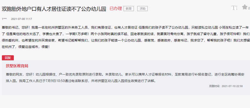 此外,还有一位网友在人民网“领导留言板”上反映,自己是一名在杭州的外来务工人员,有居住证和人才居住证,但是家里的双胞胎读不了公办幼儿园,只能读私立幼儿园,面临离家远且学费贵的问题。
