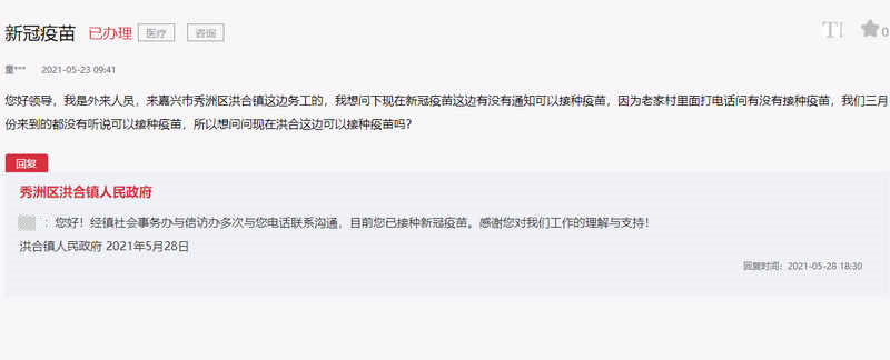 此外,还有网友在人民网“领导留言板”上反映,自己是外来人员,来嘉兴市秀洲区洪合镇务工。自3月份来后,一直没有听说可以接种疫苗,想问洪合镇是否可以安排接种疫苗。