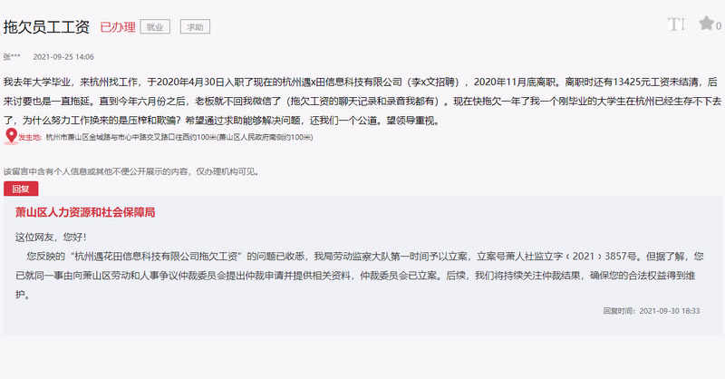 对此,杭州市萧山区人力资源和社会保障局在回复中表示,该局劳动监察大队第一时间予以立案,立案号萧人社监立字﹝2021﹞3857号。但据了解,该网友已就同一事由向萧山区劳动和人事争议仲裁委员会提出仲裁申请并提供相关资料,仲裁委员会已立案。后续,萧山区人力资源和社会保障局将持续关注仲裁结果,确保该网友的合法权益得到维护。