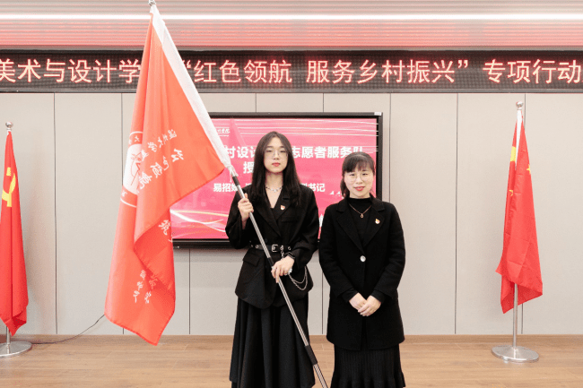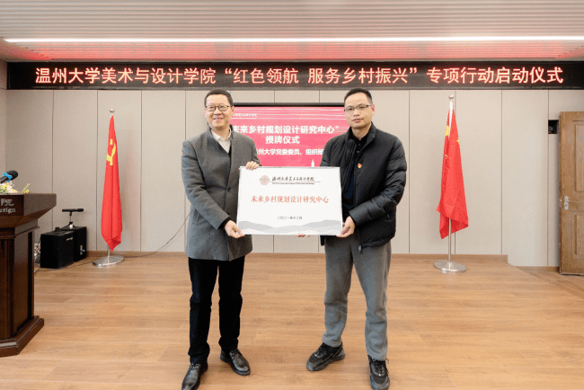 自党的十九大提出乡村振兴战略以来,温州大学师生积极探索发挥高校的智慧和力量、服务温州乡村振兴。近年来,温大美术与设计学院依托美术学和设计学专业优势,也做了不少探索和实践。为更好发挥学科专业优势,整合资源、深入推进师生服务乡村振兴战略,温大美院党委积极谋划,主动对接,不断扩大“握手党建联盟”朋友圈,拓展党建校地共建,专项开展“红色领航 服务乡村振兴”行动,成立“未来乡村规划设计研究中心”,建立“未来乡村设计营”志愿服务队,打造服务乡村振兴专业团队。启动仪式上,温州大学党委委员、组织部长郑信军为“未来乡村规划设计研究中心”授牌,温州大学团委副书记易招娣为“未来乡村设计营”志愿者服务队授旗。