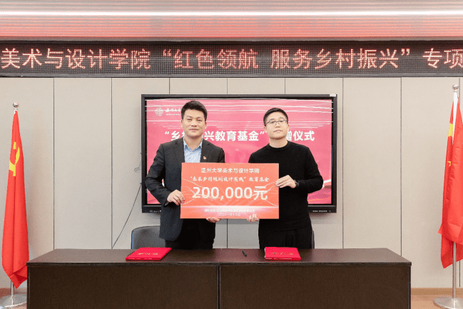 此次“红色领航 服务乡村振兴”行动,得到社会各界的大力支持,美院优秀校友、浙江映筑环境规划设计有限公司总经理颜士洲先生无偿捐赠20万元,成立“温州大学美术与设计学院乡村振兴教育基金”,用于专项资助和奖励学院乡村振兴实践项目及服务乡村振兴领域做出贡献的优秀教师与学生。