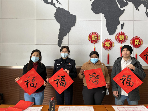 温州大学党委副书记庄兴忠、市教育局、瓯海出入境管理大队、茶山派出所、中国银行温州分行、学校相关部门负责人一起参与了活动,并将充满中国味的新年祝福送到每一位留学生手上。(吴铨铨)