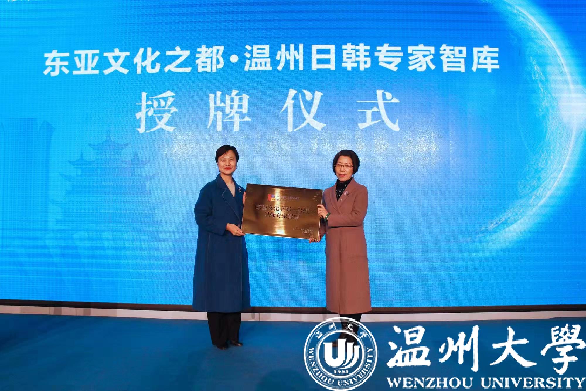 为发挥温州对外开放先行优势,推动“2022年东亚文化之都·中国温州活动年”建设,更好地促进东亚文化之都的国际文化交流,加强对日韩、东盟、欧洲及世界各国的研究和了解,温州大学外国语学院和温州市文化广电旅游局联合成立“东亚文化之都-温州日韩专家智库”,现场进行了授牌仪式,温州市文化广电旅游局朱云华局长为温州大学外国语学院进行了授牌。该智库主要以温州大学外国语学院日语、韩语教师(均为毕业于国外高校的海归博士)组成,依靠温州大学强大的资源优势,邀请多位中日韩文化专家,加盟东亚文化之都温州日韩专家智库,持续为东亚文化研究、文都相关活动及决策、多语种翻译、志愿者服务提供充足智力支持,以展示瓯越文化魅力,讲好中国故事,让中华文化走出去。“东亚文化之都-温州日韩专家智库”的成立,将进一步发挥世界温州人的资源与文化优势,助力温州“2022东亚文化之都”的建设。