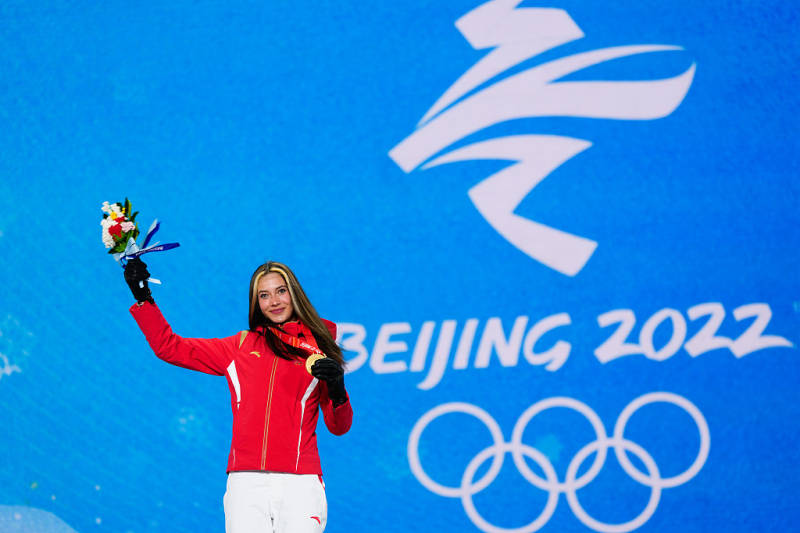2022北京冬奥会自由式滑雪女子U型池颁奖仪式:谷爱凌收获第3枚奖牌。图片来源:视觉中国