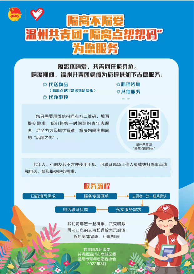 为了更好地做好隔离人员的服务工作,3月11日,温州市县两级团委推出了“隔离点帮帮码”,鹿城团区委第一时间将宣传海报转发至20个隔离点微信群内,半小时内就收到了隔离人员的需求。