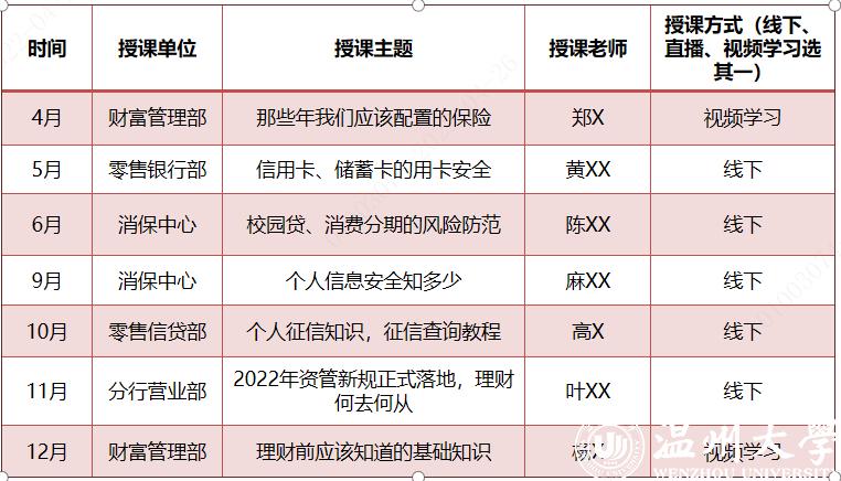 为落实将金融教育纳入国民教育体系工作,招商银行温州分行计划按月在温州大学商学院开展月度金融讲堂。通过广泛征集系统内金融教育课件,制定《招商银行温州分行月度金融讲堂授课表》,明确全年授课主题、授课老师及授课方式。授课主题包括理财、基金、黄金、保险、外汇、个人贷款、银行卡(信用卡)使用、防范电信诈骗等内容,授课方式包括班级(金融宣讲团)现场授课、网络直播、视频学习等方式。