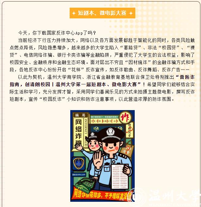 为了让更多学生了解金融知识,防范金融诈骗,金融宣传教育基地联合温州大学保卫处特别推出“普防诈指南,创清朗校园|温州大学第一届短剧本、微电影大赛”,通过短剧本、微电影的制作,营造浓厚的防诈氛围,让更多的学生能更深刻理解防范电信诈骗的重要性。截至4月22日,共收到来自5个学院共计22份作品,如教育学院作品《贷价》和商学院作品《贷价》,两个作品虽然题目相同,但主题主线的切入点却大有不同,给同学们日常防诈、反诈提供新的视角,目前所有作品正在火热投票评选中。