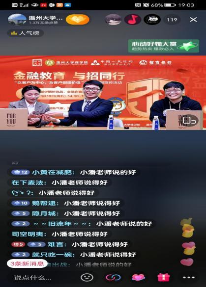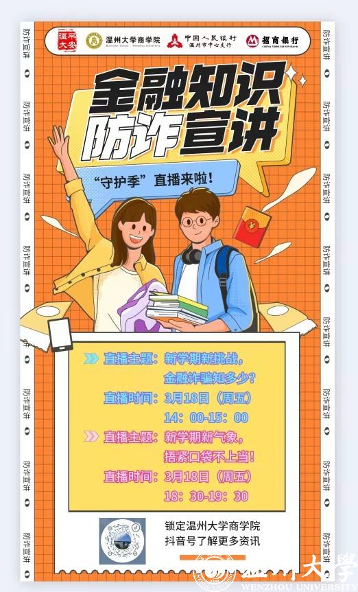 为让在校学生更好地学习金融教育知识、提升金融防诈意识和金融素养,维护校园和谐稳定,3月18日,在人行温州市中心支行指导下,温州分行联合温州大学商学院在金融宣传教育直播基地开展“3.15”消费者权益保护周防诈直播活动。在直播中,招商银行理财经理与温州大学商学院党员金融公益宣讲团成员通过生动形象的案例介绍,讲解了当前电信诈骗常用伎俩,并通过在线与学生互动、编辑顺口溜等方式,提升金融教育的参与度与传播性,活动通过抖音直播的方式进行,整场活动收获1.5万+关注量。与此同时,为了能让防诈宣讲走进班级、走进课堂,达到入脑入耳入心的效果,温州大学商学院党员金融公益宣讲团成员下驻到温州大学各学院、各班级进行宣讲。自4月以来,宣讲团成员已陆续在商学院、化学与材料工程学院、建筑工程学院、生命与环境科学学院、电气与电子工程学院、外语学院等学院宣讲,覆盖班级达50余个,覆盖学生人数高达约2700人。