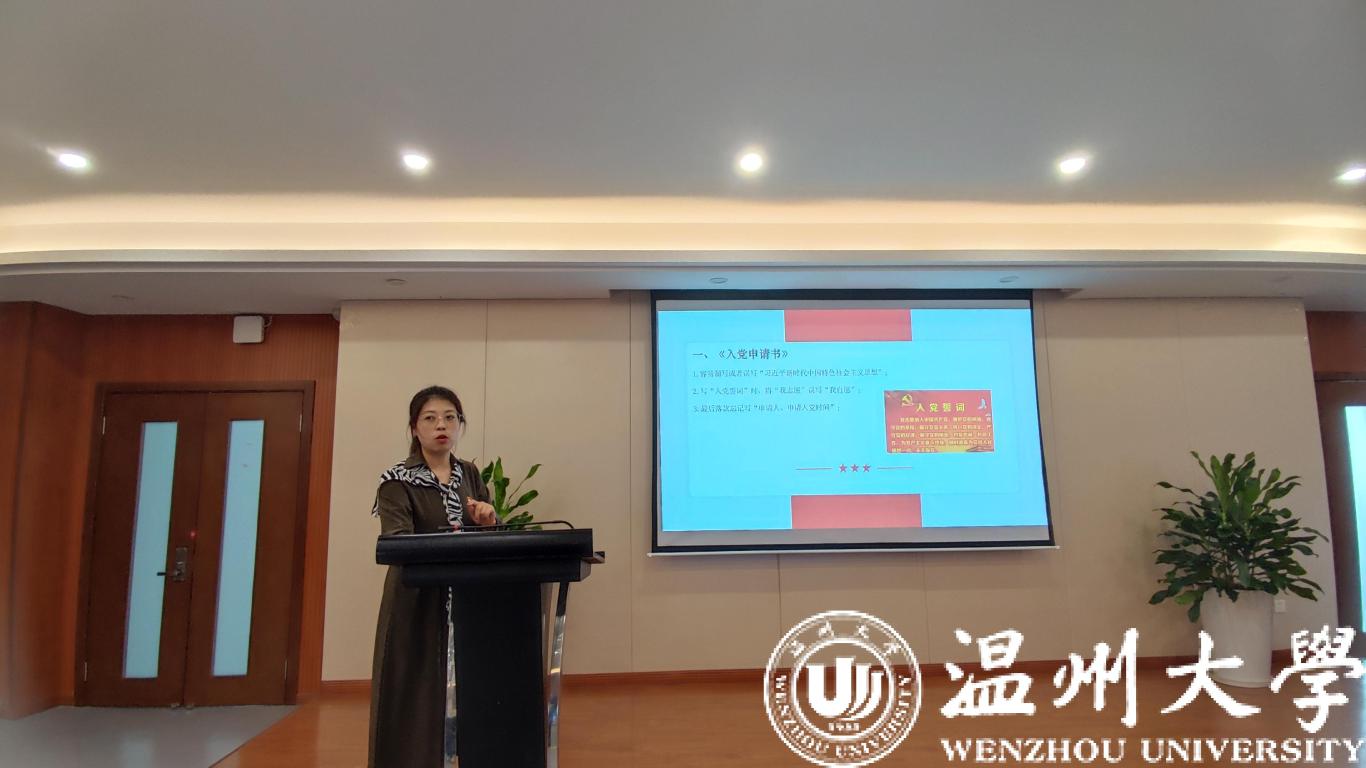 作为组织员,方乐平老师首先说明了在和党员谈话中发现的一些问题;然后强调入党志愿书的重要性,提醒各支部在必须要严、细、全;最后希望各支部委员在工作过程中,提高服务意识,做好表率。杨奇老师向各支部详解介绍了温州大学发展要求,从入党申请人到转为正式党员,每个环节需要把握的重点,大家要相互学习,把握好党员发展的全过程。史凤娟老师根据上级党组织反馈的情况和日常工作中发现的问题,各支部不仅要把工作做完,更要把工作做好。最后由研究生第一党支部姚旭凯介绍了如何打造支部特色、本科生第三党支部傅镜霏分享了从共青团员到共产党员的成长历程。