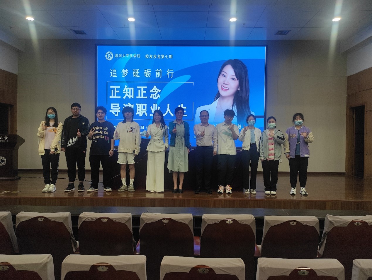 5月12日,温州大学商学院第七期校友沙龙活动在信息楼报告厅顺利举行。此次活动旨在让优秀校友向学弟学妹分享行业心得,交流职场体会,畅谈人生感悟,也是企业高管进课堂的活动。本次活动由商学院党委书记郑彩莲主持。党委副书记唐华、辅导员黄汉以及19级金融工程专业和19级财务管理专业本科生参与本次活动。