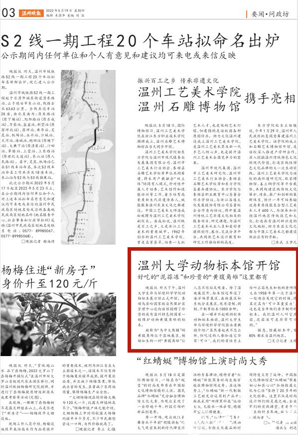 昨天下午,温州大学生命与环境科学学院动物标本展示馆正式开馆。泰顺乌岩岭国家级自然保护区管理中心还向该馆捐赠了珍贵的具有温州特色的国家一级保护动物黄腹角雉的标本。