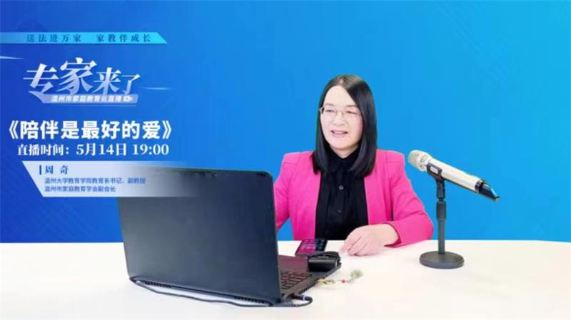 为深入贯彻习近平总书记关于注重家庭家教家风建设重要论述,将“重视家庭文明建设,努力使千千万万个家庭成为国家发展、民族进步、社会和谐的重要基点”重要精神落到实处,有力推动《中华人民共和国家庭教育促进法》宣传实施,2022年5月14日,在全国首个家庭教育宣传周期间,温州大学教育学院教育系党支部书记、副教授、硕士生导师,温州大学家庭教育研究院巾帼文明岗岗长、温州大学家庭家教家风讲师团团长、浙江省教育学分会副会长、浙江省家庭教育学会理事、温州市家庭教育学会副会长周奇做客“专家来了”温州市家庭教育云直播,开展《陪伴是最好的爱》家庭教育公开指导课。本次直播以“送法进万家 家教伴成长”为主题,旨在弘扬传承中华民族家庭美德,树立良好家风,推动形成家庭文明新风尚。整场直播吸引了12.5万人次观看,并获得2万多的网友点赞。