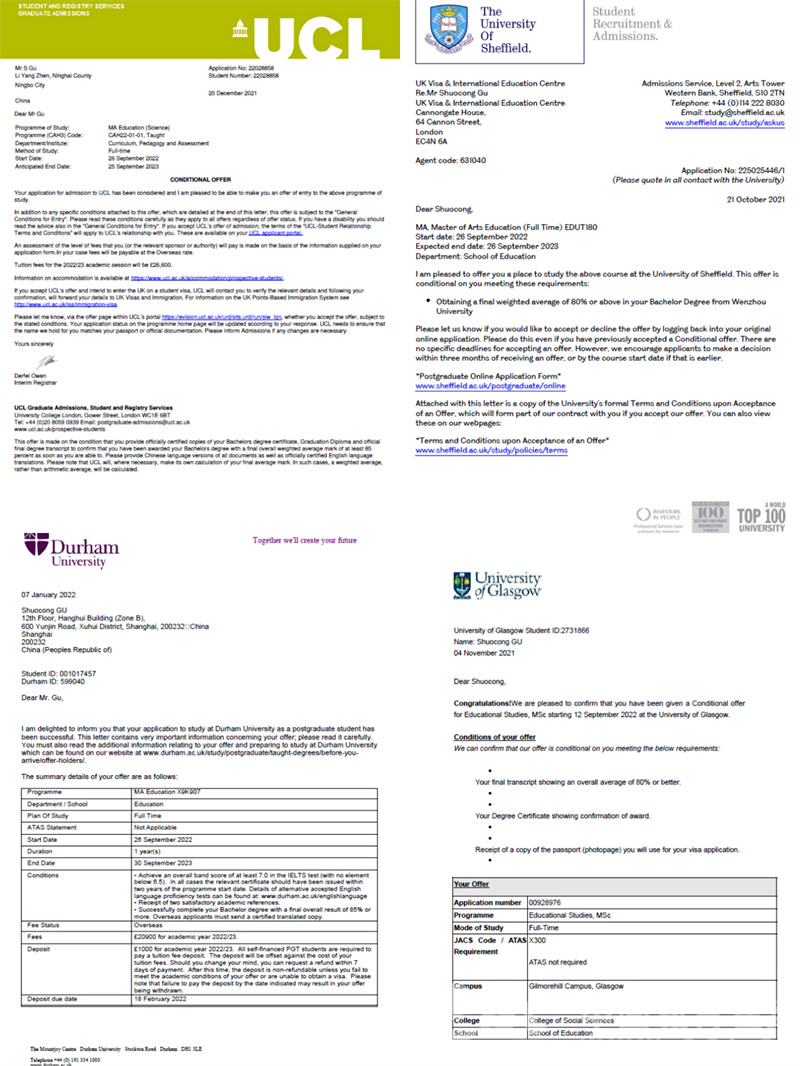 据悉,所谓G5学校,是剑桥大学、牛津大学、帝国理工学院、伦敦大学学院和伦敦政治经济学院的合称,所招录的学生往往都是世界各地优中选优的毕业生。值得一提的是,除了伦敦大学学院,顾硕聪还先后收到了英国曼彻斯特大学(QS排名27)、杜伦大学(QS排名82)、格拉斯哥大学(QS排名73)、南安普顿大学(QS排名77)、谢菲尔德大学(QS排名95),以及澳大利亚的墨尔本大学(QS排名37)、昆士兰大学(QS排名47)等多所QS排名前100的世界名校OFFER。一人独收八份世界名校录取通知书,创下了温州大学近年来的新高,见证了温州大学人才培养质量的稳步提升。