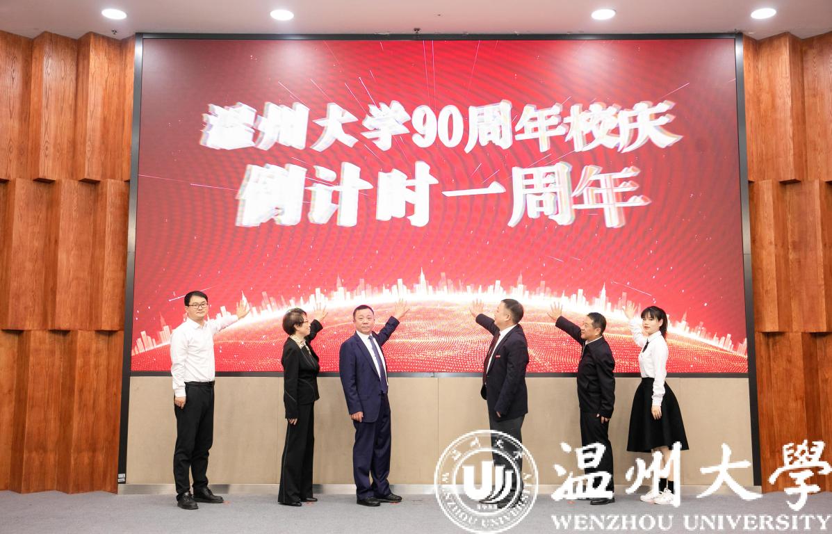 校党委书记谢树华,校长赵敏,老同志代表原校党委书记陈艾华,校友代表吴东,教师代表、建工学院院长王军,学生代表、教育学院2019级学前本科林弋湉同学共同点亮大屏幕,正式启动温州大学90周年校庆倒计时一周年。