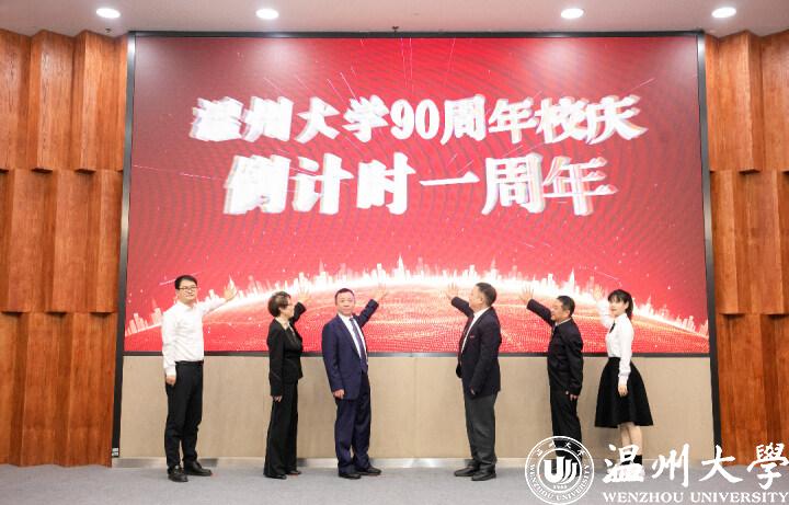 校党委书记谢树华,校长赵敏,老同志代表原校党委书记陈艾华,校友代表吴东,教师代表、建工学院院长王军,学生代表、教育学院2019级学前本科林弋湉同学共同点亮大屏幕,正式启动温州大学90周年校庆倒计时一周年。