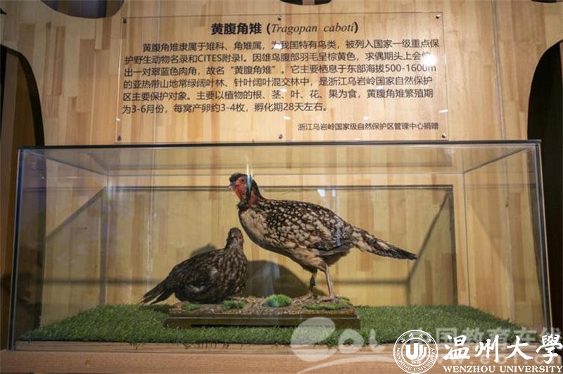 5月18日下午,温州大学生命与环境科学学院动物标本展示馆正式开馆。泰顺乌岩岭国家级自然保护区管理中心向该馆捐赠了珍贵的具有温州特色的国家一级保护动物黄腹角雉的标本。