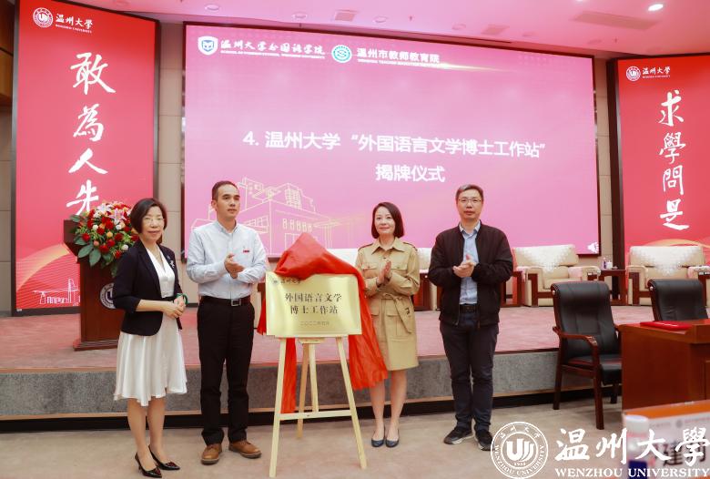 开幕式上进行了签约、揭牌和聘任仪式。为进一步加强携手合作,温州大学外国语学院院长叶苗和温州市教师教育院院长李芳代表双方单位共同签署了框架合作协议。温州大学在温州市教师教育院设立“外国语言文学博士工作站”,李芳院长、叶苗院长和温州大学教务处处长罗建利、温州大学教育发展研究院院长蒋金崇一起为温州大学“外国语言文学博士工作站”揭牌。双方还互聘了基础教育(英语)专家,共同致力于英语基础教育教师职前职后教育一体化探索与实践。