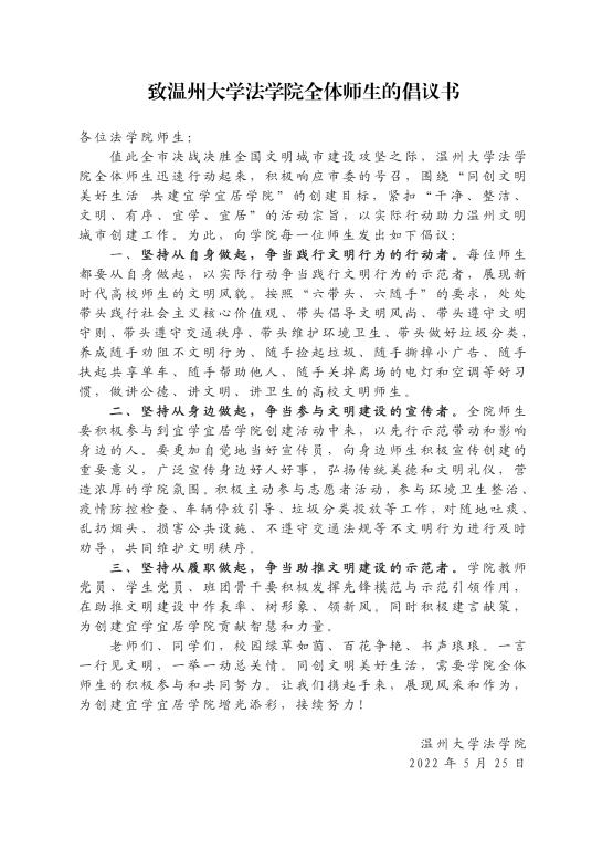 5月25日下午,值此温州全市决战决胜全国文明城市建设攻坚之际,温州大学法学院全体师生迅速行动起来,积极响应市委的号召,围绕“同创文明美好生活 共建宜学宜居学院”的创建目标,紧扣“干净、整洁、文明、有序、宜学、宜居”的活动宗旨,重点突出乱放垃圾、乱拉线管、乱贴乱画、乱停车辆等“五乱”整治,深入开展环境整治师生大联动,以实际行动助力温州文明城市创建工作。