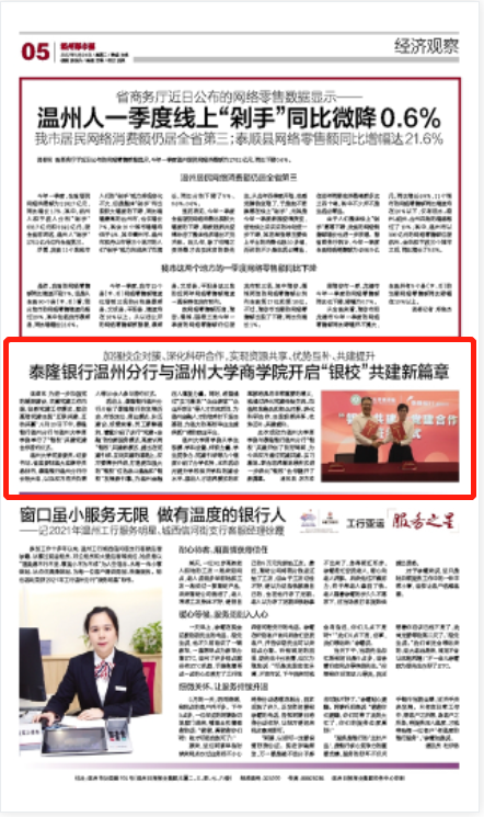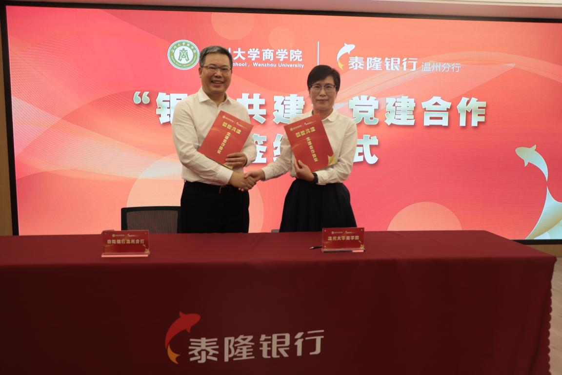 温都讯 为进一步加强党的基层建设,丰富党建工作内涵,创新党建工作模式,推动基层党建实现“互联共建、互助共赢”,5月20日下午,泰隆银行温州分行与温州大学商学院举行了“银校”共建党建合作签约仪式。