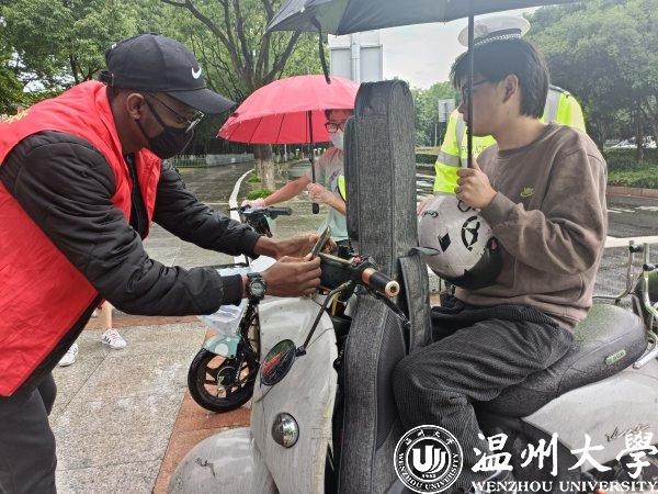 “同学,骑电动车不能带人,请你配合一下。”“同学,骑乘电动车请戴好头盔,遵守交通信号灯。”5月30日下午,来自温州大学的3名外国留学生和该校外国语学院几名学生一起,在市交管局四大队八中队交警的带领下,当起了这一带的交通“督导员”,对温州大学城中心南路过往的非机动车交通违法行为,进行文明出行劝导。