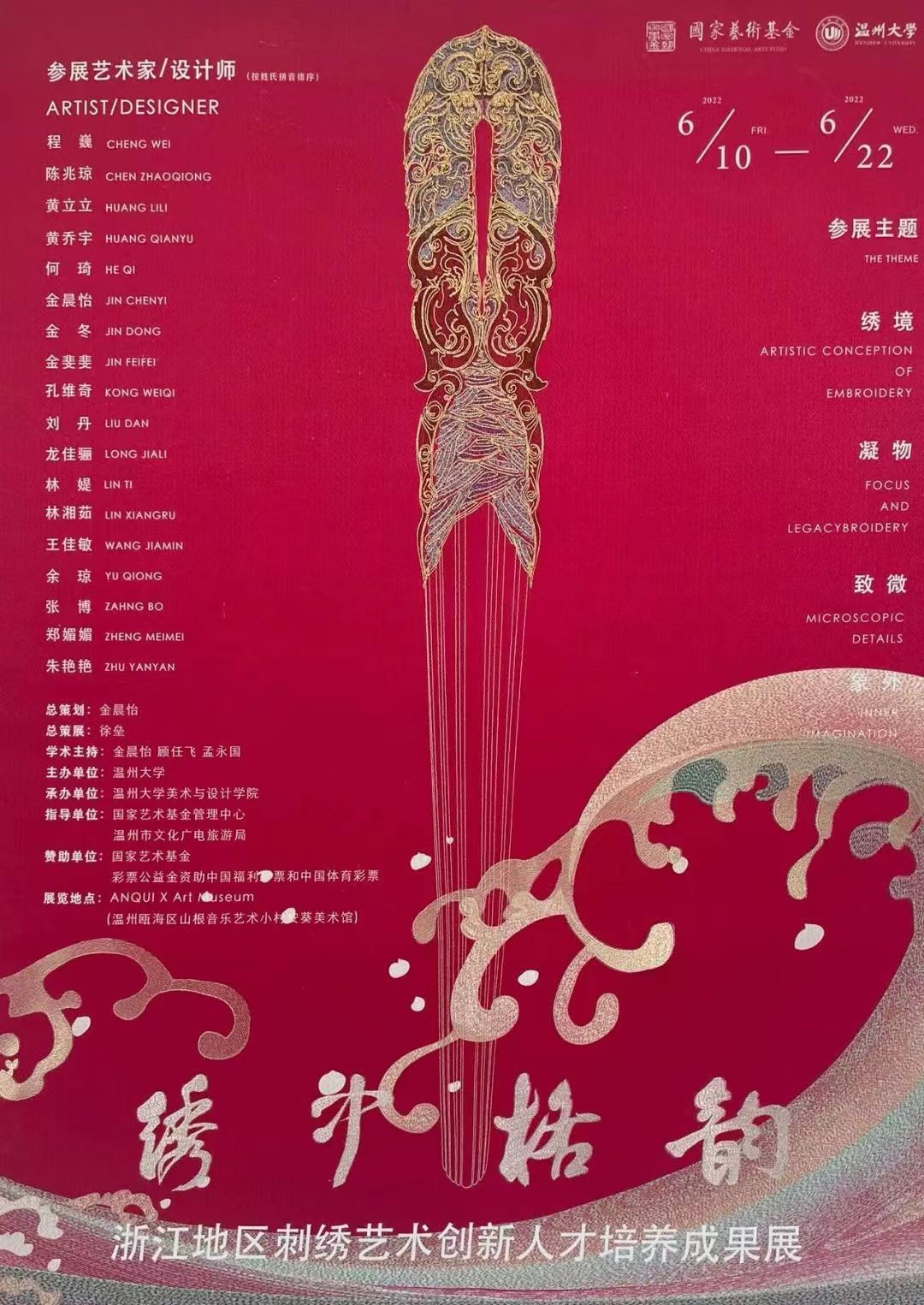 6月10日上午,国家艺术基金2020年度艺术人才培养资助项目“浙江地区刺绣艺术创新人才培养成果展”在Anqui x Art museum(山根音乐艺术小村安葵美术馆)开幕,温州大学副校长徐和昆、温州市文化广电旅游局副局长李方喜、浙江省民间文艺家协会主席杭间、温州大学美术与设计学院院长谢子静等领导和专家、以及来自全国各地的刺绣非遗传承人50余人出席开幕式。