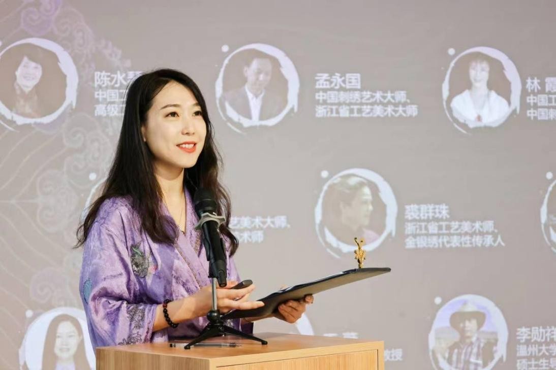 项目负责人、温州大学美术与设计学院金晨怡教授作本项目的介绍。《浙江地区刺绣艺术创新人才培养项目》由温州大学为主体实施,依托温州大学美术与设计学院及温州大学发绣研究所和温州市民俗博物馆平台优势,并得到了温州市文化广电旅游局的指导,通过对中青年刺绣艺术工作者文化技艺传承理念、技艺研习深造与创新的培养,以适应当代刺绣艺术继续发展创新的需要,弥补刺绣艺术人才断层,促进浙江地区刺绣艺术事业的振兴和繁荣发展。本项目的教学团队云集了校内外知名教授学者、国家级、省级刺绣大师和画家、著名设计师,项目历经6个月的艺术素质研修、刺绣技能研修、刺绣艺术创作与制作实践课程、田野考察与展览观摩、自由创作及导师组指导作品、成果展五个阶段。