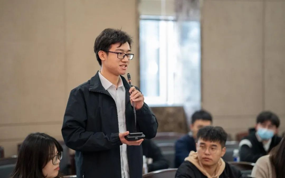 仪式后,与会者共同观看影片《温州数学家家园》和《苏步青谷超豪先生与温州大学》,并以“大力弘扬科学家精神,积极推进作风学风建设”为主题进行讨论交流。我院21级本科辅导员张嘉璇、20级本科生陈智钻、22级博士生唐朝亮、22级硕士生万励、20级本科生刘语灵、22级本科辅导员林洁依次发言,气氛热烈。其中,曾在《此身到老属于党》微党课情景剧中饰演苏步青先生的温籍学生陈智钻讲述了饰演苏老的感受,他深为苏老的爱国精神与钻研精神所感染,希望毕业后有机会回到温州为家乡发展贡献自己的力量,赢得了温州大学师生的拍手称赞。
