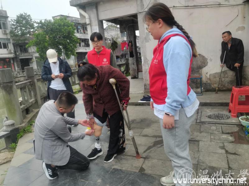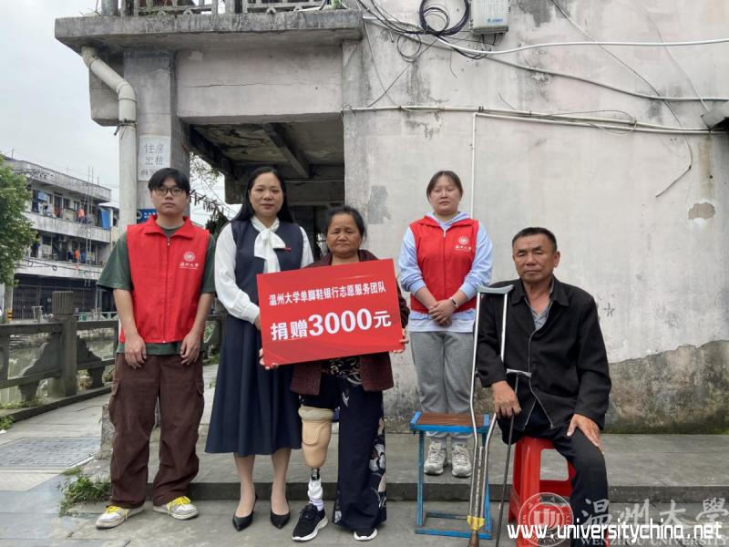 温州大学师生帮助的是一名50多岁的曾阿姨,是他们帮扶了三年的单脚残疾人。曾阿姨的丈夫也是一名姓曾的高位截肢残疾人。他们虽来自不同的省份,因为命运的相似,他们俩相相互扶持共同生活多年了,目前居住在温州南白象街道一个低矮破旧的房屋里。志愿者们三年来为他们送来各季节的鞋子,米、面、油等生活用品;还在看望慰问他们的同时,给曾氏夫妇的家中墙壁贴上了贴纸,帮助他们整理和改造住宿环境。志愿者们在多次帮扶过程中了解到曾阿姨的截肢是具备安装假肢的条件的,只是打零工的收入微薄,只够温饱,没有多余的钱购买假肢。而曾阿姨也因为长期需要跪着做家务活等,截肢的右脚残肢上的结痂一层一层,又厚又硬,志愿者每次看到都非常心疼。为了让曾阿姨能够生活的更加便利,志愿者们四处联系筹措,希望能为曾阿姨装上一副全新的假肢。通过多方努力,志愿者们联系到瓯海残联并获得了5000元的资助。这离全部的假肢制作费用还差一部分,于是就有了开始的捐款情景。
