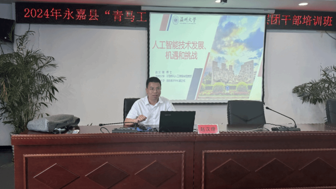 6月21日,民革温州大学基层委副主委赵汉理教授应邀为2024年永嘉县“青马工程”暨“浙里青廉”基层团干部培训班学员讲授人工智能课程。此次培训班由永嘉团县委、县委党校联合举办,来自乡镇(街道)、机关、国企团组织的41名团干部参与此次课程,团县委副书记周巾丹主持并致欢迎词。