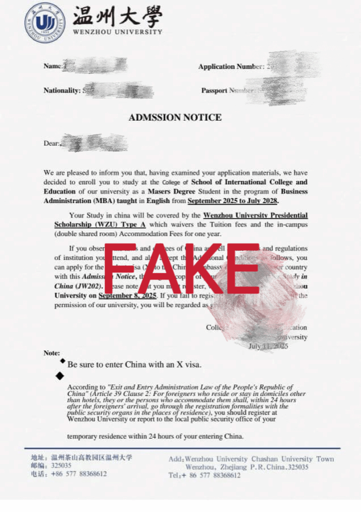 The College of International Education at Wenzhou University has recently identified several fraudulent activities involving the unauthorized use of our official seal and the forgery of admission documents purportedly issued by our International Student Admissions Office. These illicit acts include the illegal collection of fees from international applicants under false pretenses.
